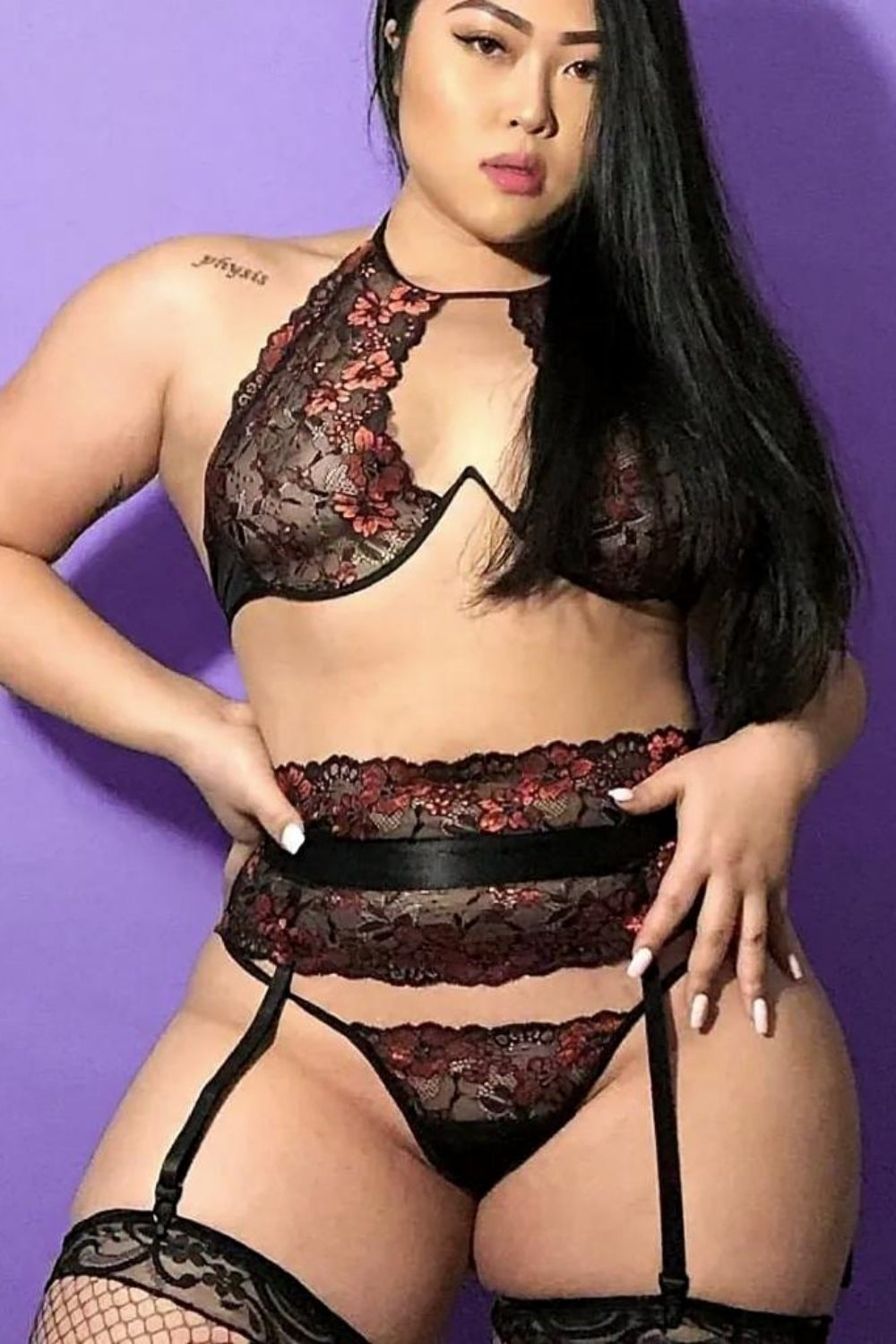 Ensemble 3 pièces brodé en dentelle ajourée. Soutien-gorge push-up, porte-jarretelles et culotte assortie. Élégance et sensualité assumée.
